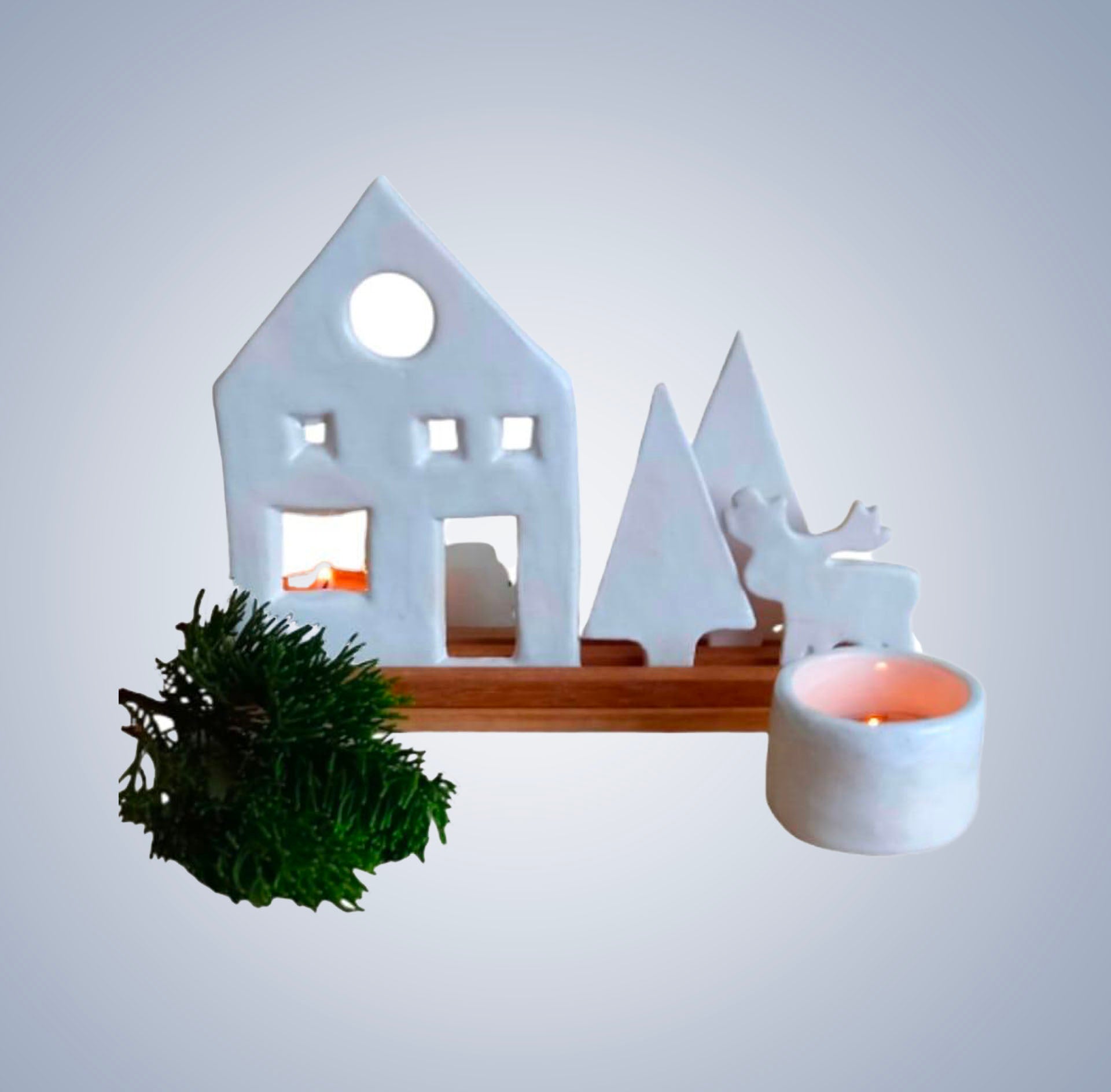 "A luz de velas, ao se esconder por trás da casinha e das formas vazadas, traz um brilho suave e mágico, preenchendo o ambiente com uma sensação de paz e ternura. Com tamanhos variados, que vão de 6 cm a 17 cm, cada peça é única em sua simplicidade e beleza. A casinha de 17 cm completa a cena, como uma pequena morada para as lembranças que habitam nossos corações."