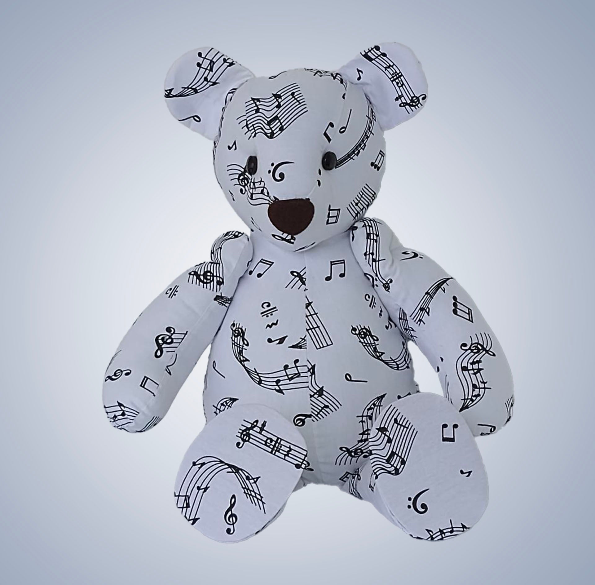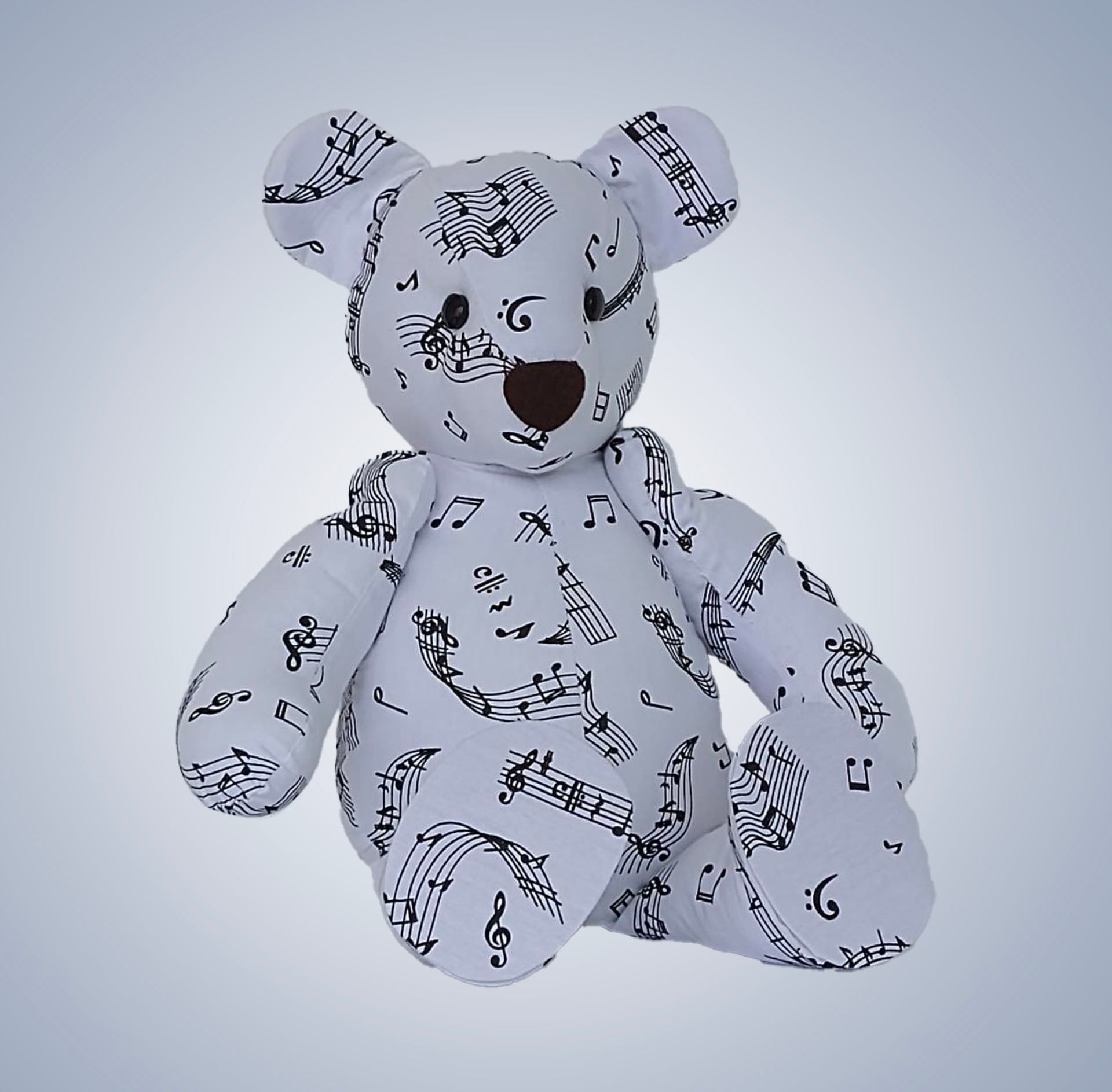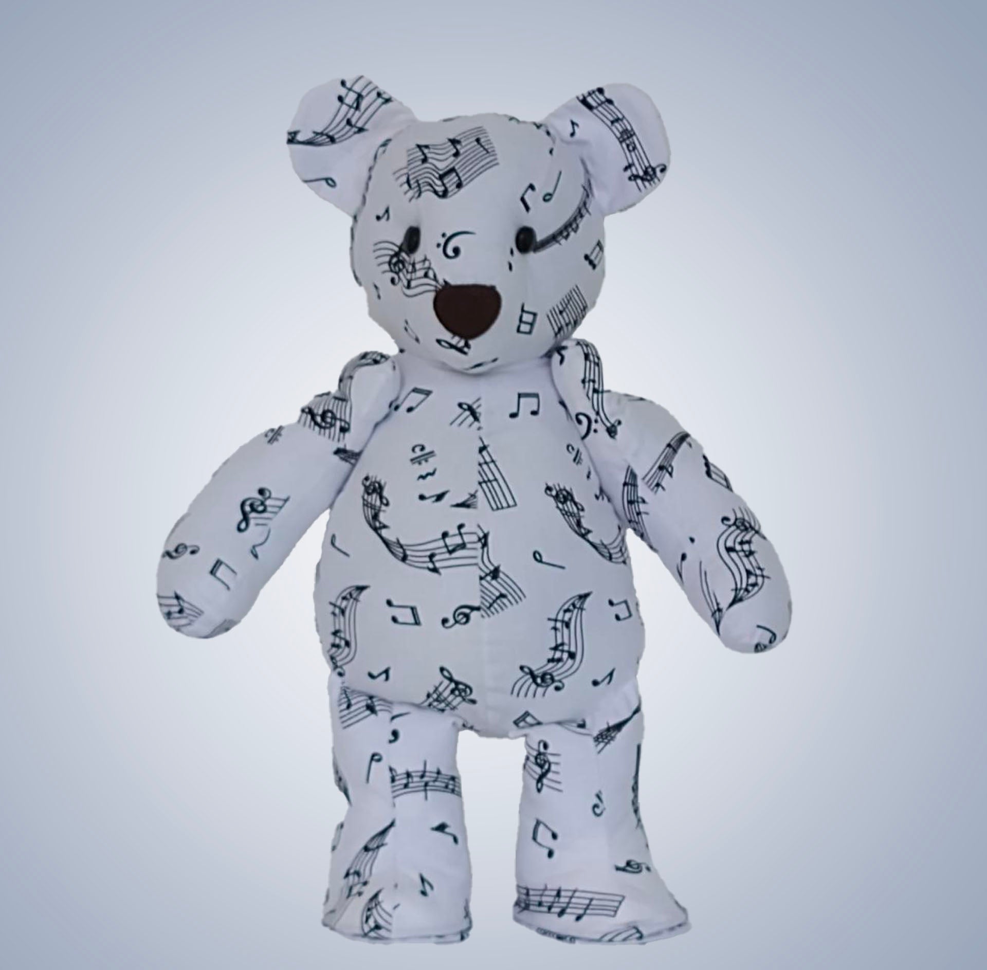 Este urso, feito de tecido estampado 100% algodão, é uma verdadeira obra de carinho e delicadeza. Seus membros, costurados com precisão junto ao corpo, oferecem firmeza e conforto, enquanto o enchimento em fibra de algodão traz a leveza e o aconchego perfeitos para cada abraço.