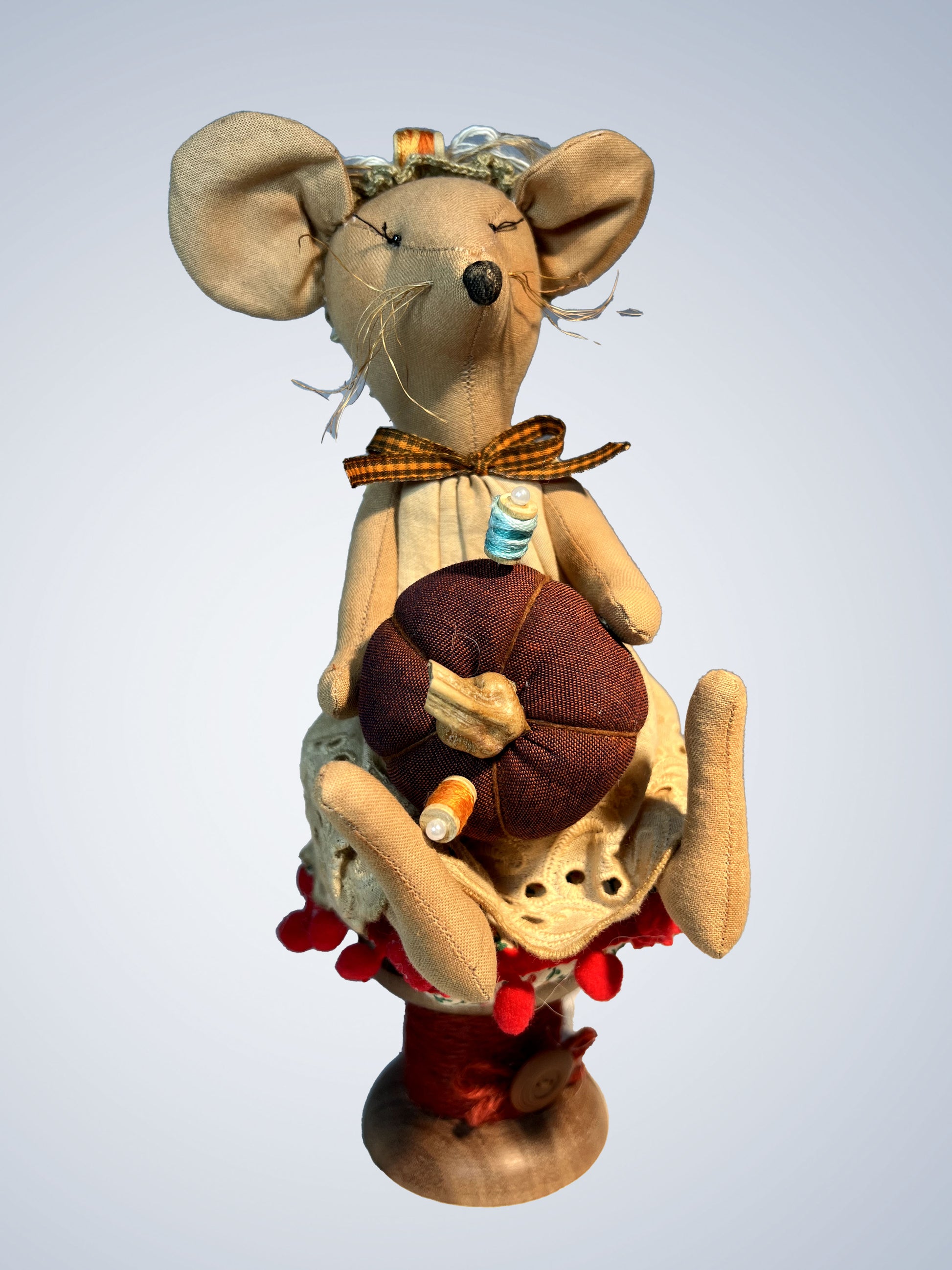 No coração de um ateliê encantado, repousa uma ratinha agulheira, guardiã de costuras e sonhos. Sua pelagem suave, envolve o carretel de madeira onde repousa com graça e delicadeza. Adornada com vestido e laço, ela personifica a elegância romântica e a ternura de uma era passada.