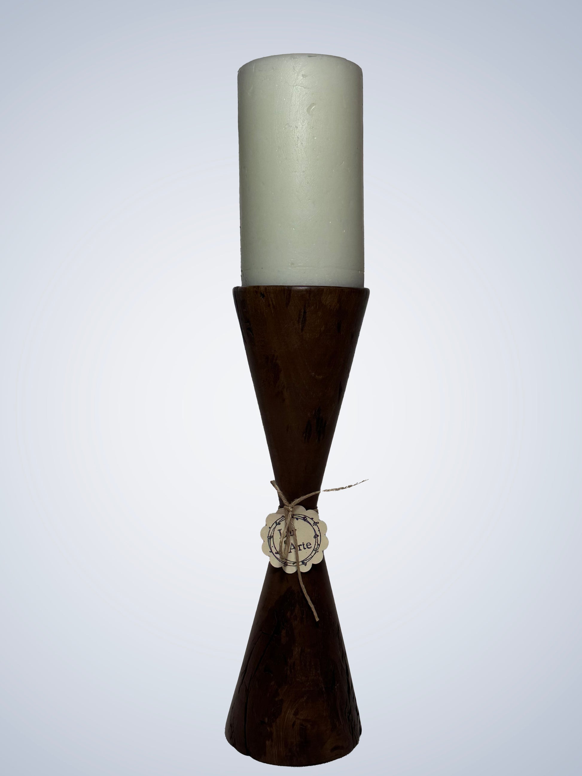 Encante-se pela nossa base exclusiva para vela, esculpida no formato de ampulheta em madeira de demolição. Cada detalhe é uma mistura de simplicidade e sofisticação.