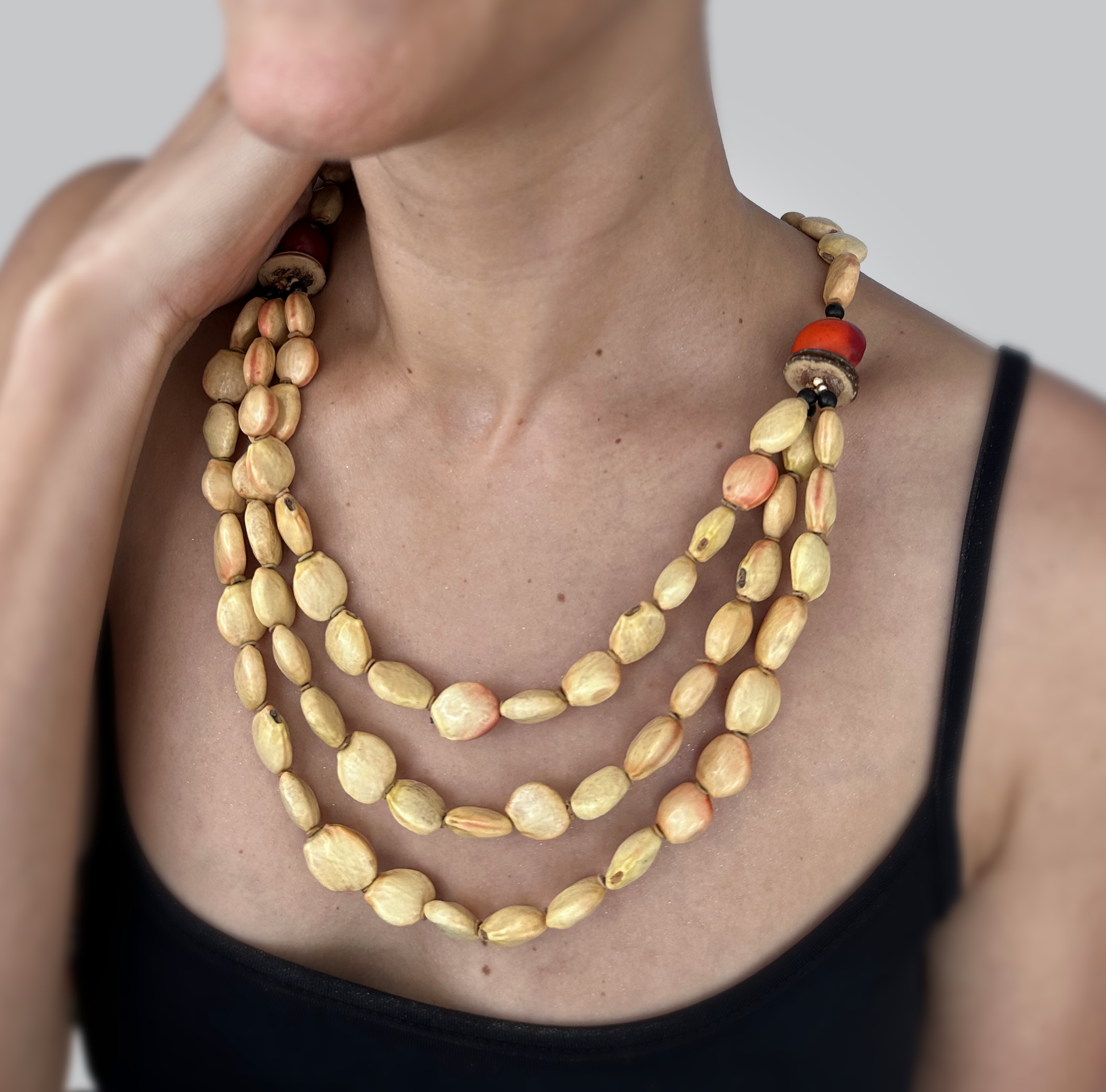 As três voltas do colar envolvem o pescoço com uma sensação de abundância e elegância. Cada semente de Piranheira, coletada com cuidado, conta a história das florestas tropicais, enquanto os detalhes em Angelim, com seus tons profundos de vermelho, acrescentam um toque de calor e sofisticação.