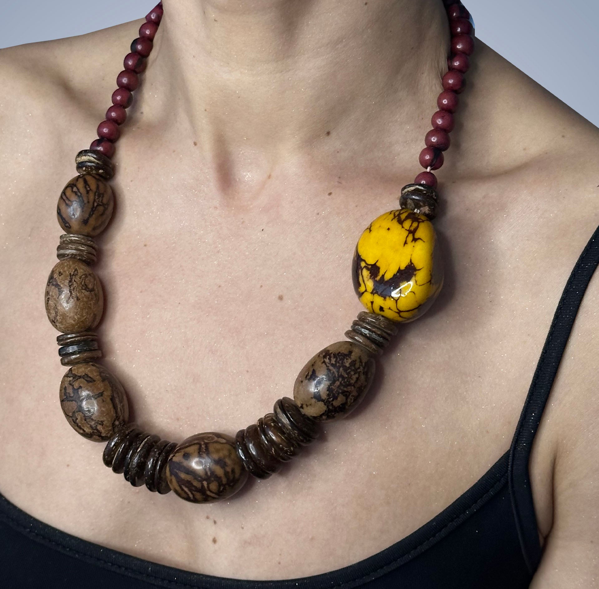 Descubra a essência da natureza em cada detalhe deste colar singular de uma volta, onde a beleza se entrelaça com a autenticidade. O fecho de fio de tucum guia um caminho de conexão com a terra, enquanto as sementes de açaí proporcionam um toque de rusticidade elegante. Cada pérola de semente de buriti e jarina tingida em tons vibrantes de vinho, marrom e amarelo traz consigo a história da natureza, capturando a luz do sol em sua cor amarela radiante.