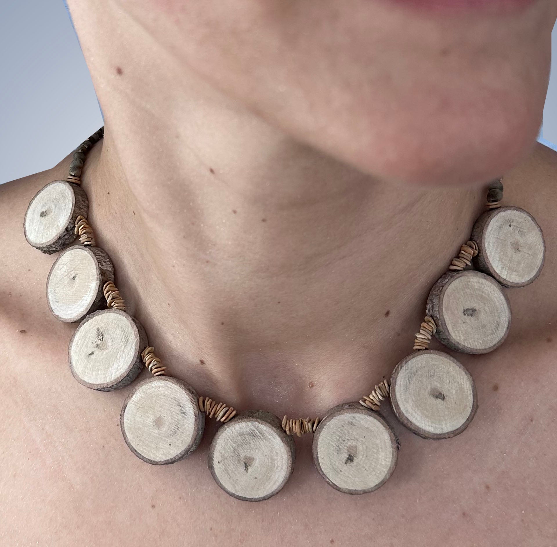 O sassafrás é nativo de florestas e capões e parente da canela, do louro e da imbuia - de crescimento lento forneceu sementes para adornar esta gargantilha. Ao longo da lateral, as sementes de quiabo adicionam uma textura suave e orgânica, como pequenos detalhes de vida que enriquecem a composição.
