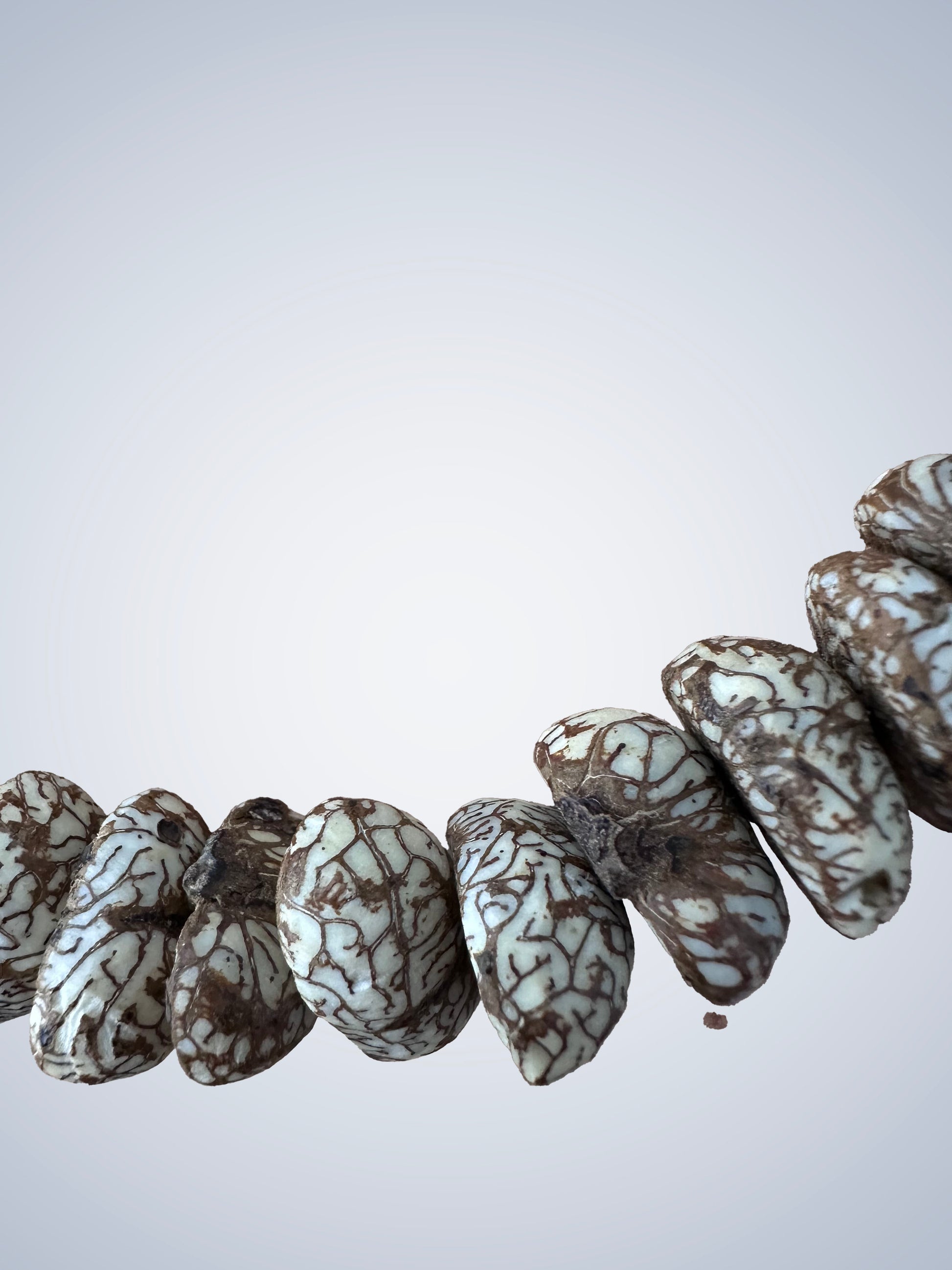 As sementes de palmeira bacaba se transformam em contas robustas e naturais, cada uma contendo a força e a resistência das árvores antigas.