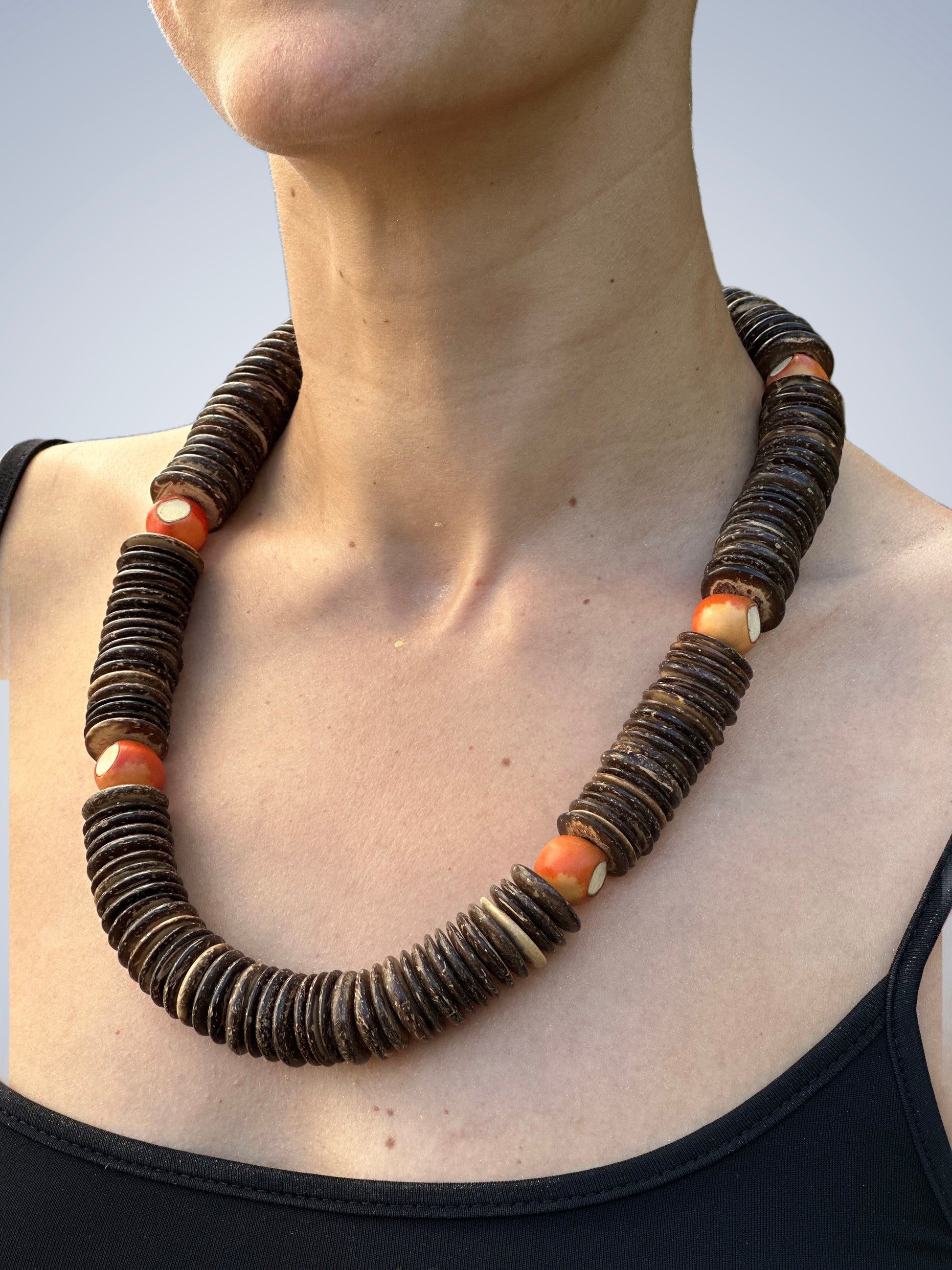 No ritmo sereno das marés tropicais, surge um colar adornado com a simplicidade da casca de botão de coco e a elegância das sementes de angelim vermelho cortadas.