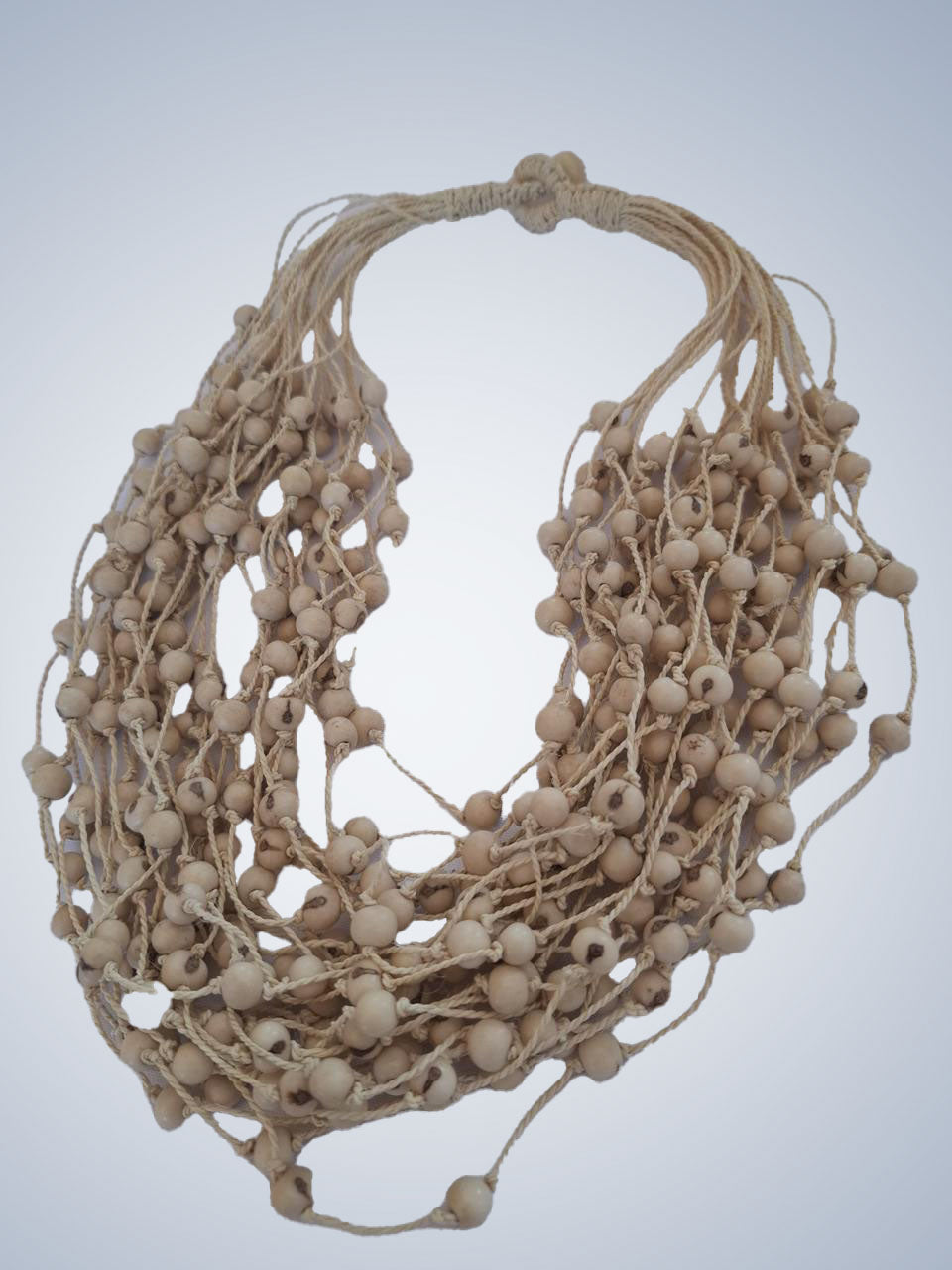 Cada uma das 330 sementes de açaí, em seu tom natural, carrega a força e a sabedoria da terra. Conectadas por 660 nós, essas sementes se entrelaçam em uma dança harmoniosa, formando um colar que é ao mesmo tempo simples e grandioso.