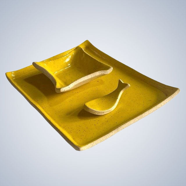 Este conjunto exclusivo de 3 peças em cerâmica artesanal foi criado para trazer sofisticação e autenticidade à sua experiência de degustar comida japonesa. Composto por um prato individual, um porta-hashi e um shoyuzara (molheira), cada peça é cuidadosamente moldada à mão em cerâmica de alta temperatura, conferindo durabilidade e elegância ao conjunto.