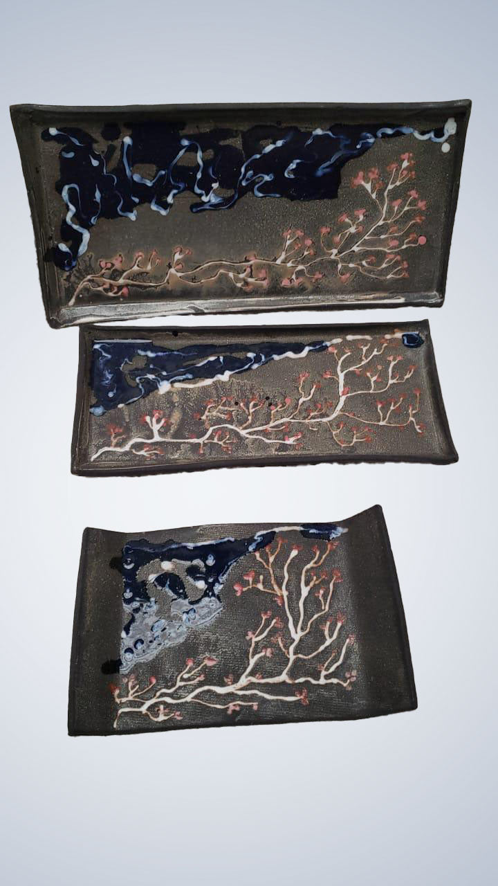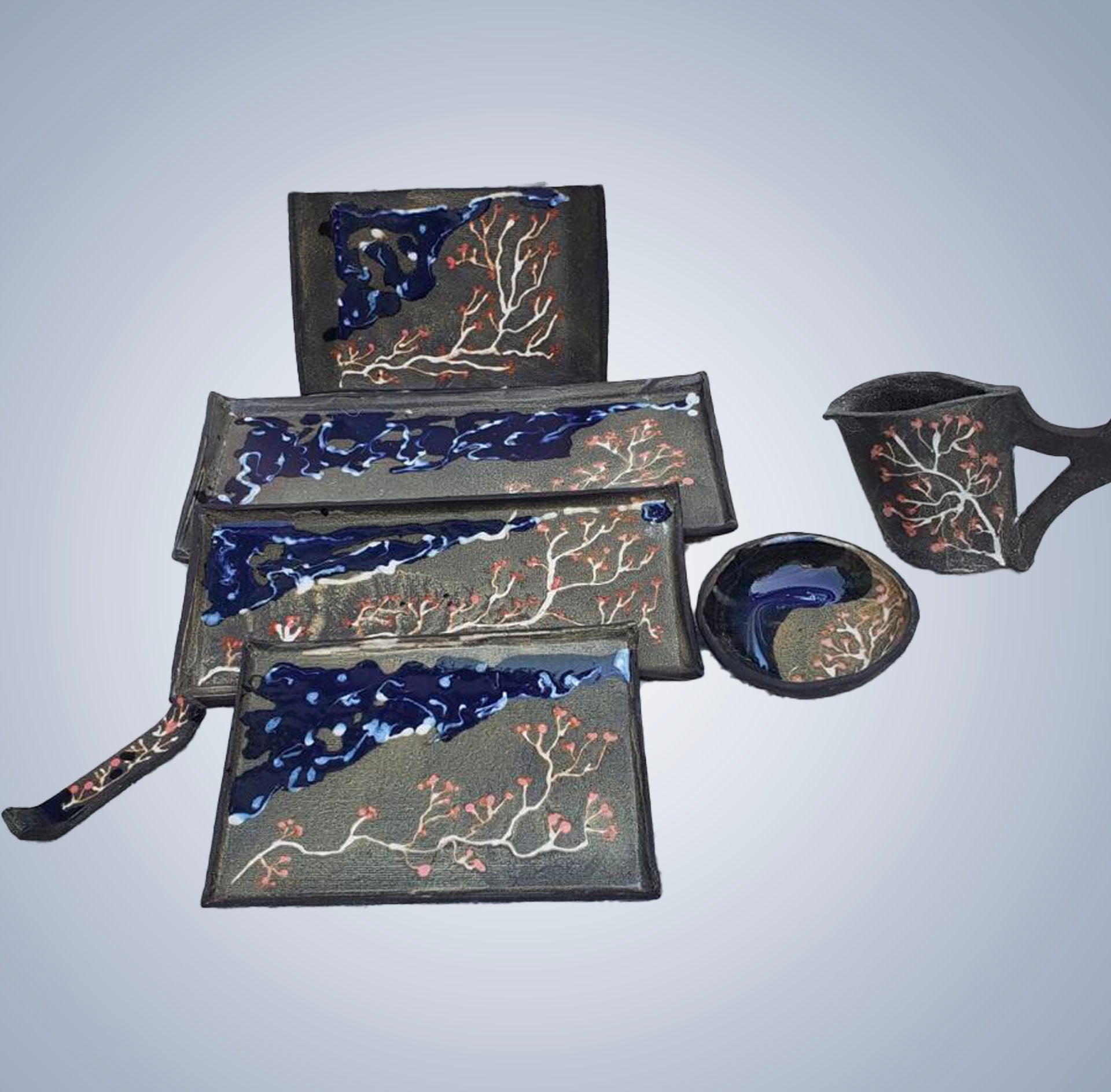 Cada peça foi moldada individualmente, resultando em um conjunto único e exclusivo. O conjunto é composto por 3 travessas para sushi e sashimi, 4 pratos individuais, 4 bowls para Shoyo, 1 pequena jarra para molho e 4 suportes para Hashi.