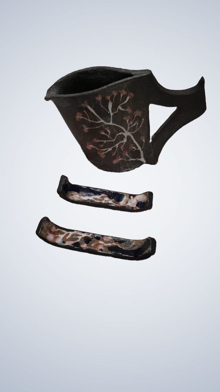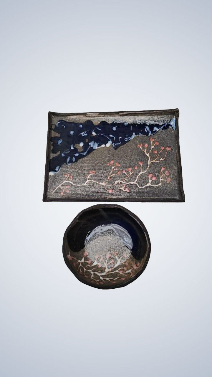 Este sofisticado jogo de sushi em cerâmica preta foi cuidadosamente feito à mão, combinando tradição e modernidade em cada detalhe. A cor preta e o acabamento artesanal trazem uma sensação de elegância minimalista, ideal para quem aprecia a arte da mesa posta e a beleza nos pequenos detalhes.