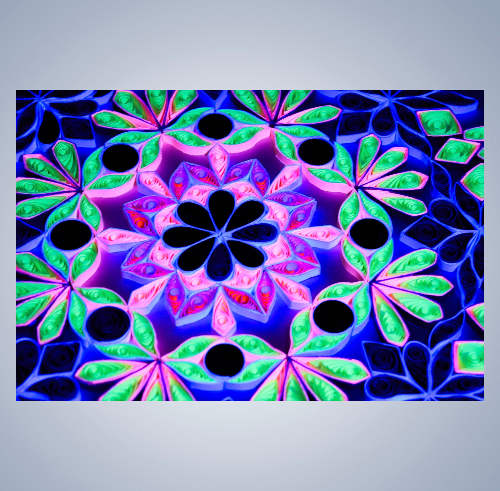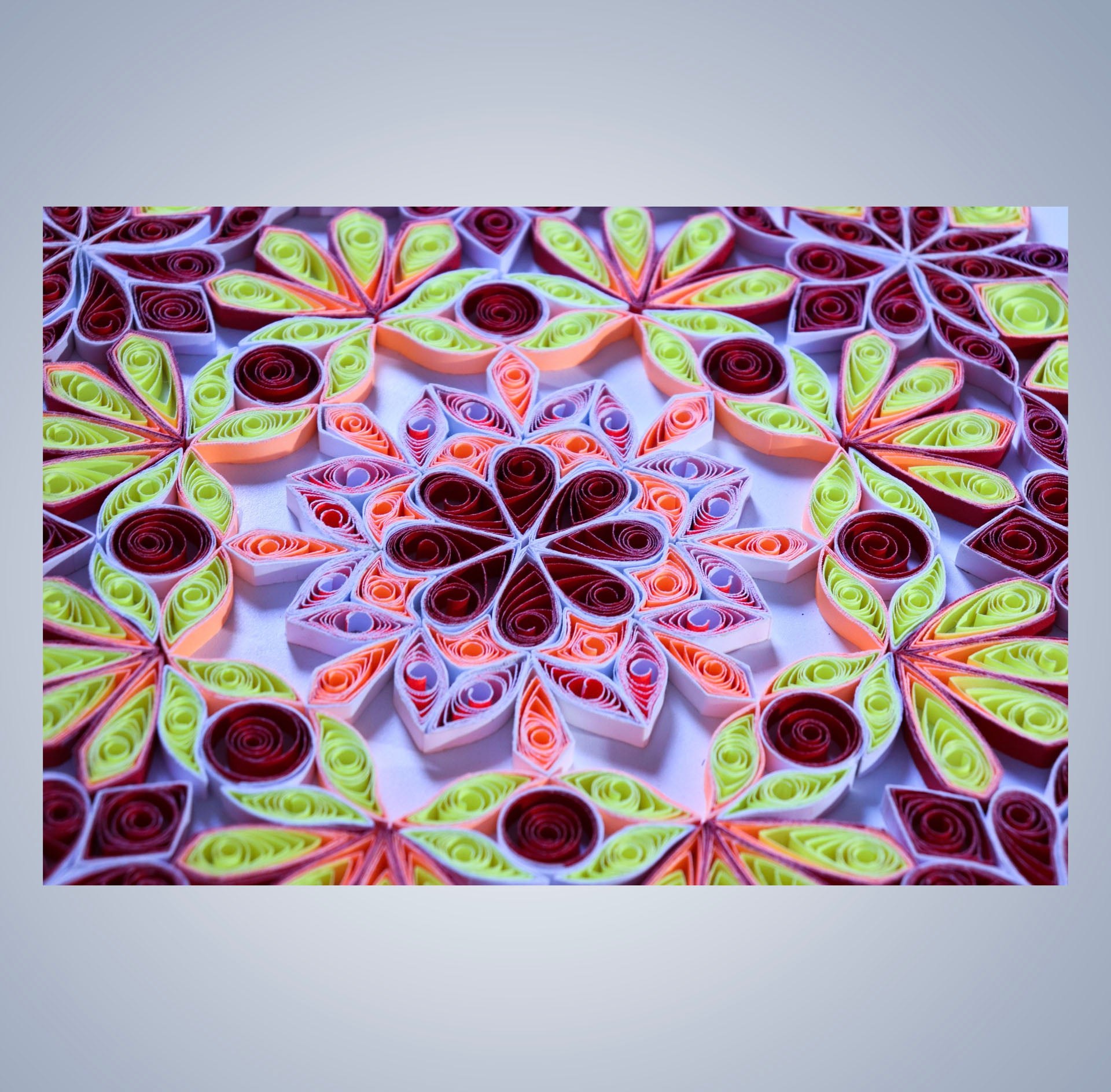 Suas cores vibrantes e formas hipnotizantes capturam a essência da tranquilidade e da meditação. A mandala é um testemunho da arte minuciosa e da dedicação do artesão. As finas tiras de papel são transformadas em uma obra-prima.
