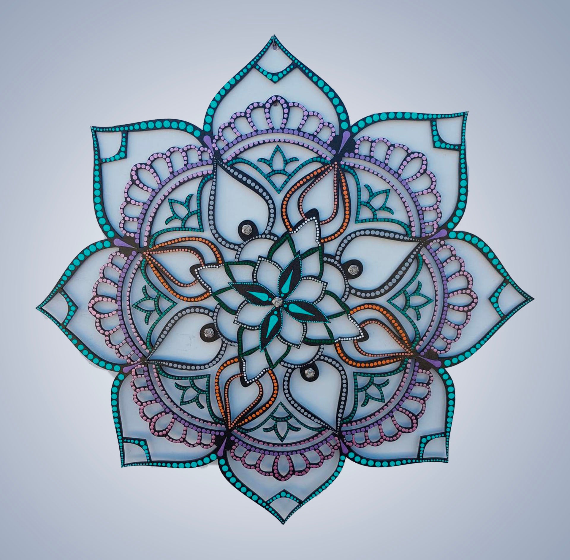 A Mandala Flor, elaborada com a técnica de pontilhismo, é uma peça que une a precisão artística com a beleza natural das flores. Milhares de pontos são aplicados com atenção para criar uma mandala que celebra a estética floral, refletindo a harmonia e a suavidade dos padrões naturais em uma obra de arte cativante.
