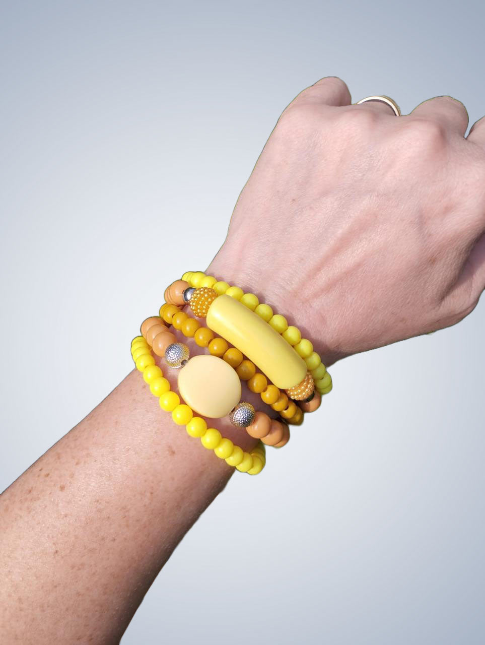 Ilumine seu estilo com o Mix de 5 Pulseiras em Tons de Amarelo, a combinação perfeita para a primavera e o verão! Cada pulseira foi cuidadosamente elaborada para trazer um toque de alegria e energia ao seu visual.