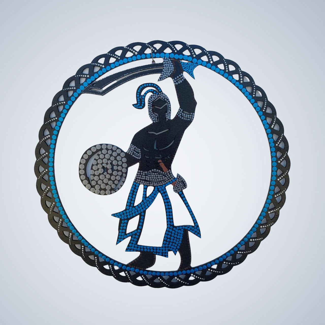 Ogum, criado através da técnica de pontilhismo, é uma peça única que combina precisão artística e profundo simbolismo cultural. Milhares de pontos são aplicados com destreza para formar uma representação vibrante e significativa, refletindo a essência e a energia do orixá da guerra e da metalurgia.