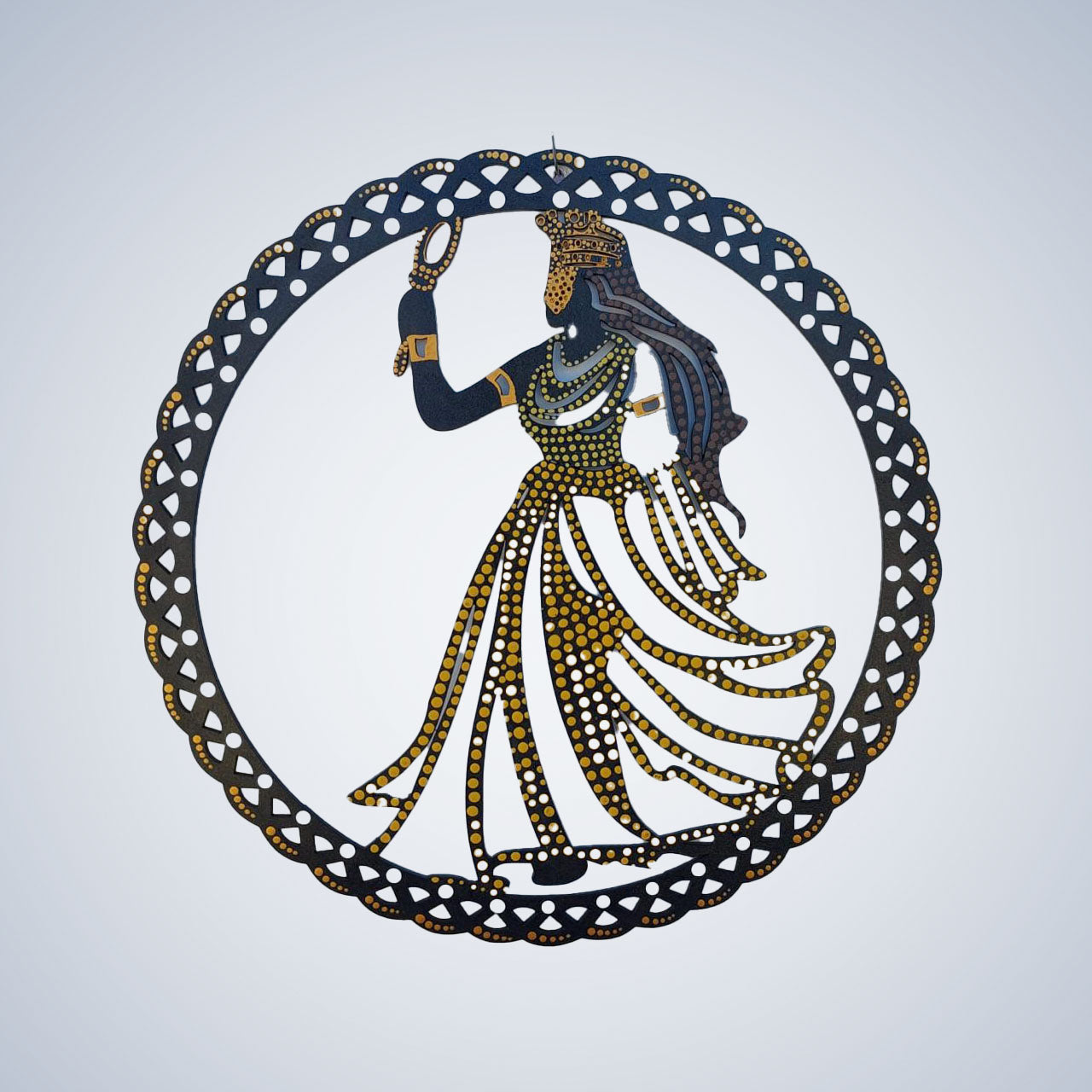 Oxum, criada com a técnica de pontilhismo, é uma peça única que combina a precisão artística com o profundo simbolismo cultural. Milhares de pontos são aplicados com cuidado para formar uma representação detalhada e expressiva de Oxum, refletindo sua essência como deusa das águas, do amor e da prosperidade.