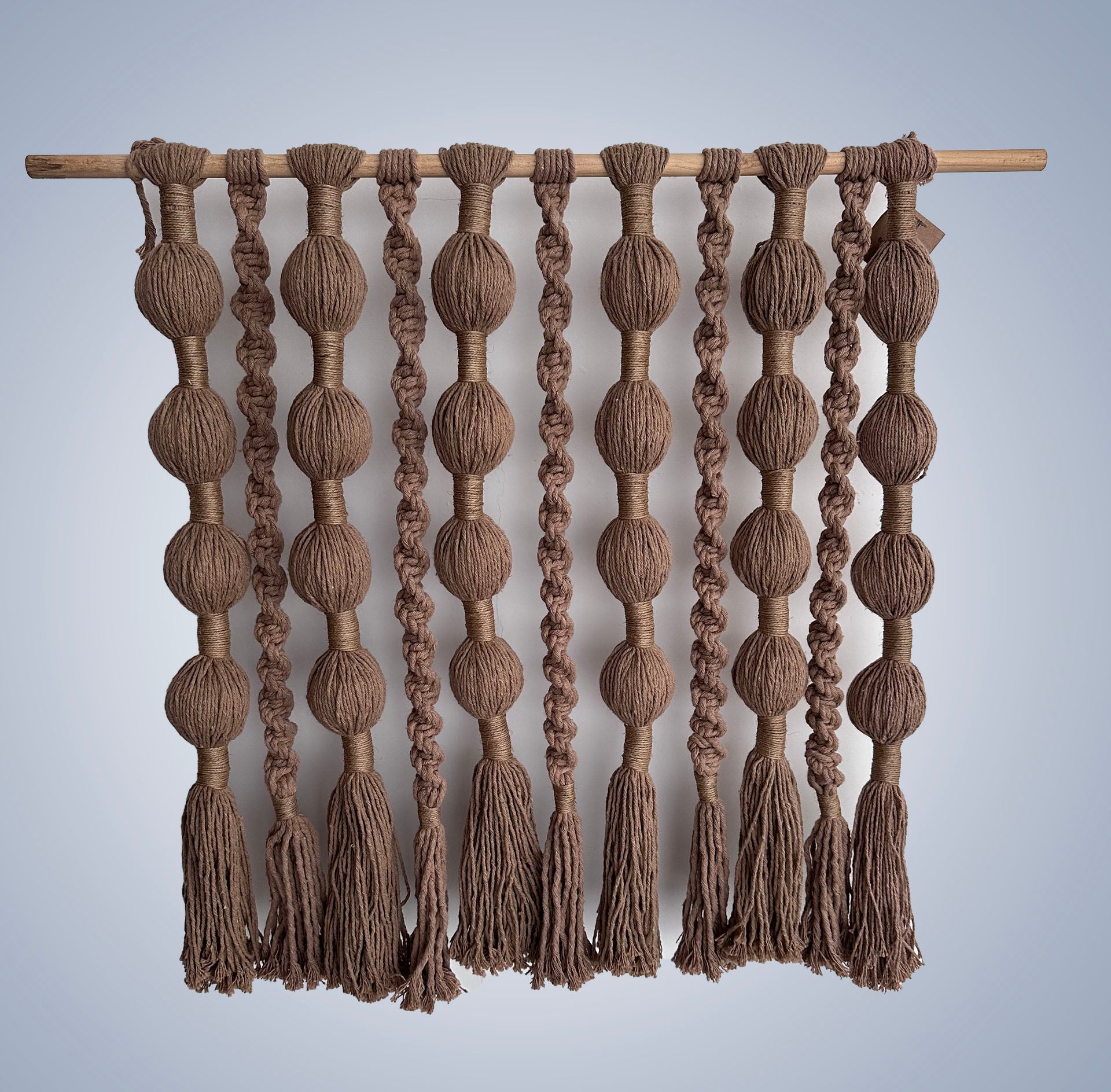 No coração das tradições artesanais, onde cada nó conta uma história e cada laçada celebra a habilidade humana, nasce este painel de macramê estilo caralanga. Inspirado nas ricas tradições do México, o painel de bolinhas em tons de marrom é uma ode à arte atemporal do macramê.