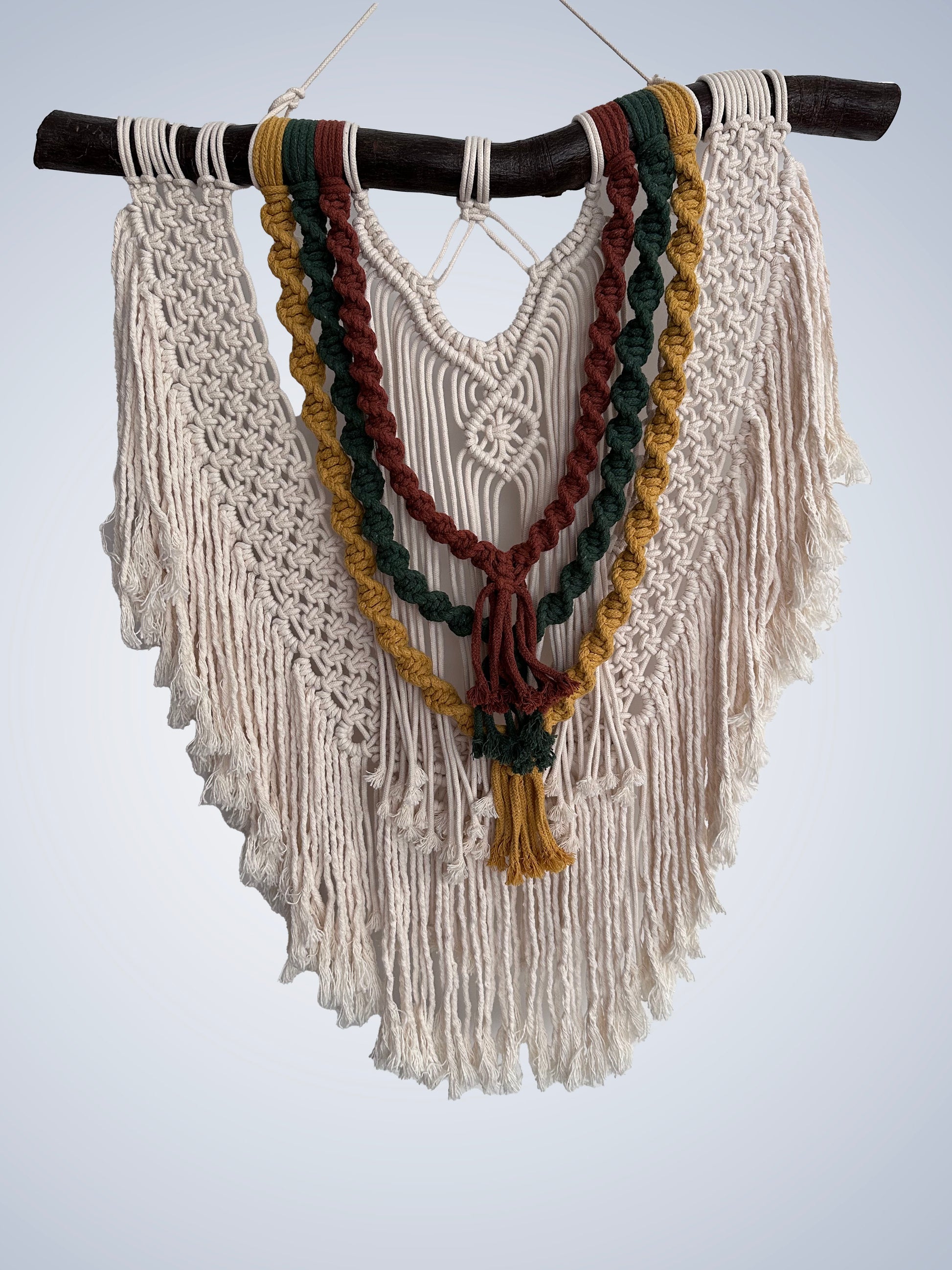 Feito com um galho natural como base, escolhido pela sua forma única e textura orgânica, este painel macramê é uma obra de arte que transcende o comum. Os fios de algodão, suaves ao toque e duráveis, envolvem o galho em padrões complexos e detalhados, criando uma peça que é ao mesmo tempo impressionante e reconfortante.