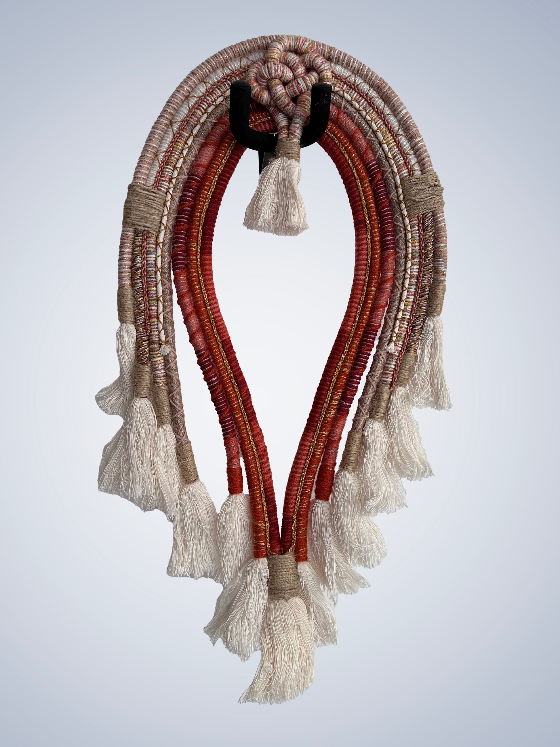 Os fios de algodão se entrelaçam com a inspiração ancestral para criar este lindo cocar, peça que une arte e história em um símbolo de beleza e tradição.