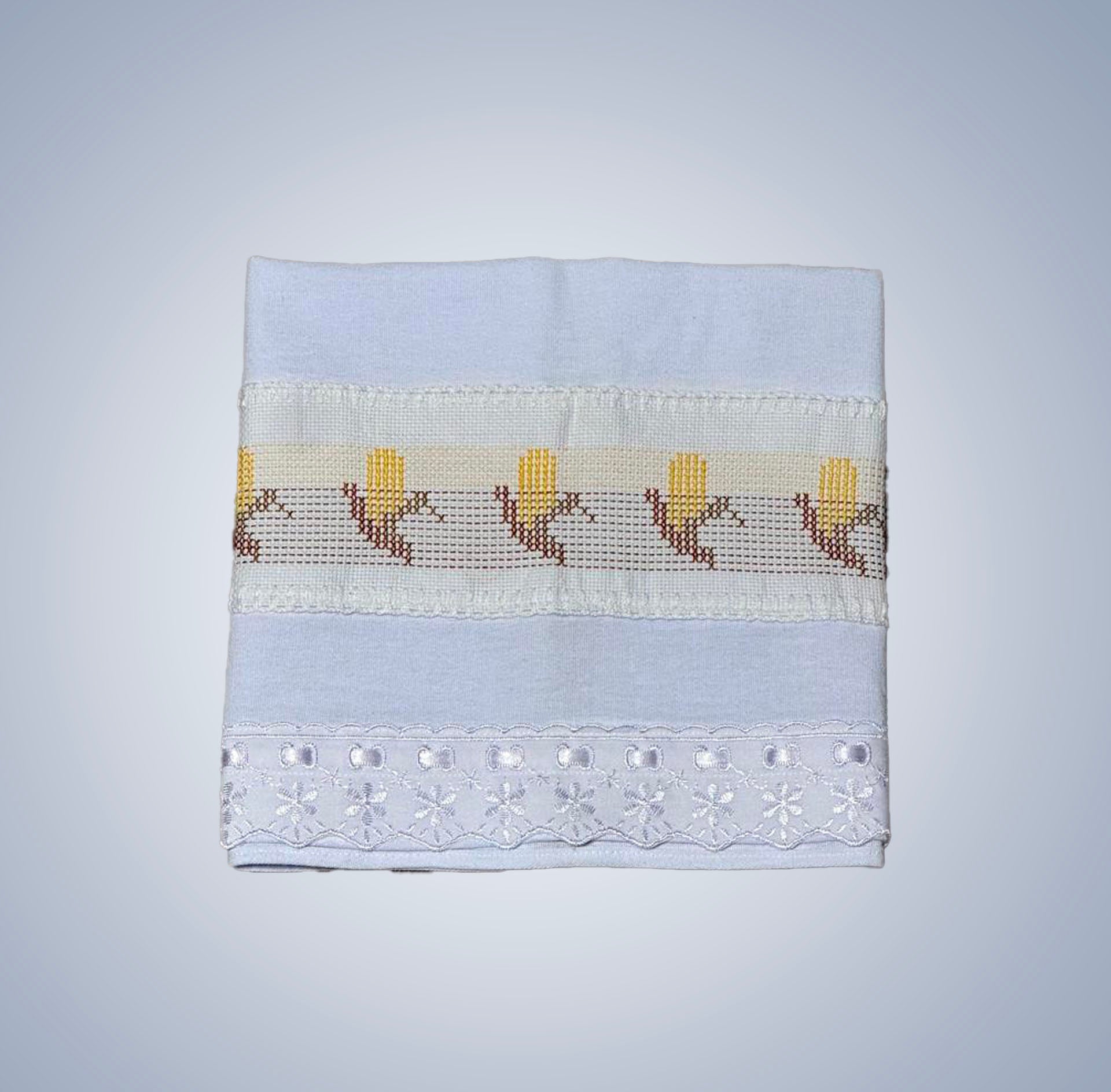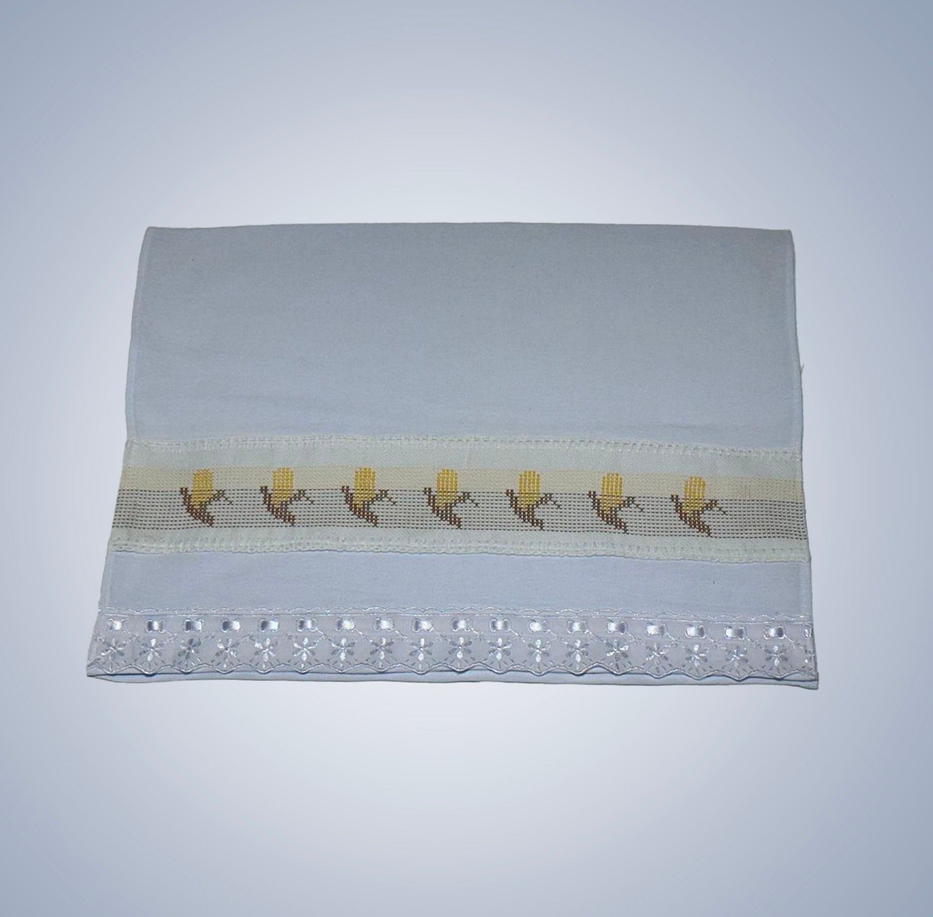 Neste pedaço de tecido, ecoa o carinho ancestral das nossas avós, que entrelaçavam linhas e memórias ao bordar seus enxovais, criando tesouros para a vida. Na era da tecnologia, resgatamos esse ofício antigo com a leveza do bordado à mão, em cada detalhe de uma banana bordada no oitinho, simbolizando a simplicidade que nutre e a arte que persiste.