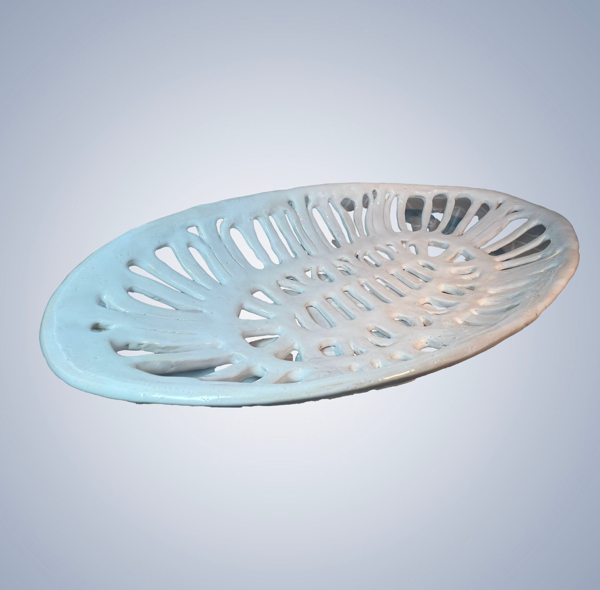 Fruteira de cerâmica que é mais do que um simples recipiente. Modelada e esmaltada à mão com uma delicadeza primorosa, esta fruteira vazada é uma celebração da habilidade artesanal e da beleza natural.