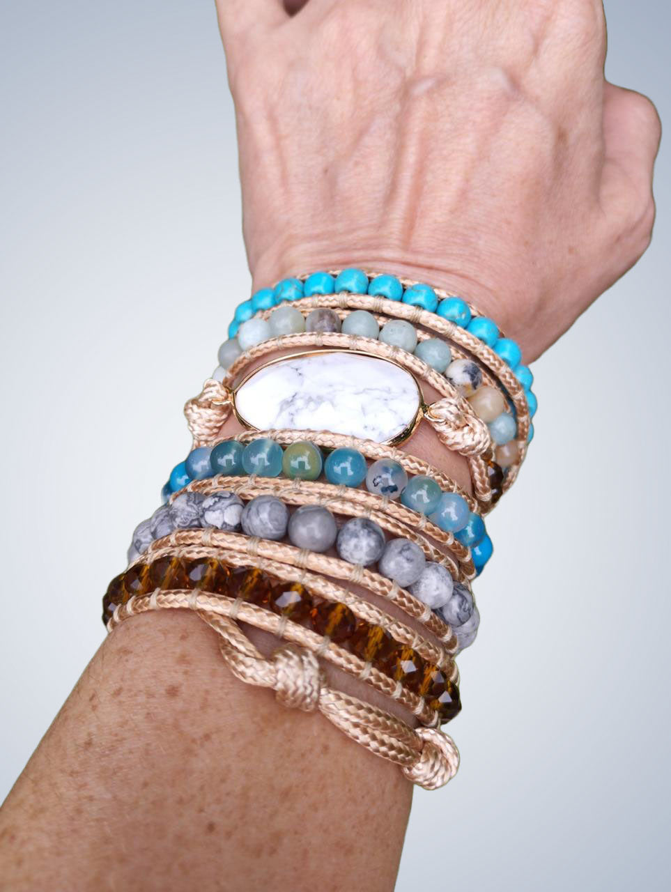 Pedras naturais: Howlita Branca, Howlita Turquesa, Amazonita, Ágata Azul e Labradorita Cristais de Vidro Corda de poliéster |