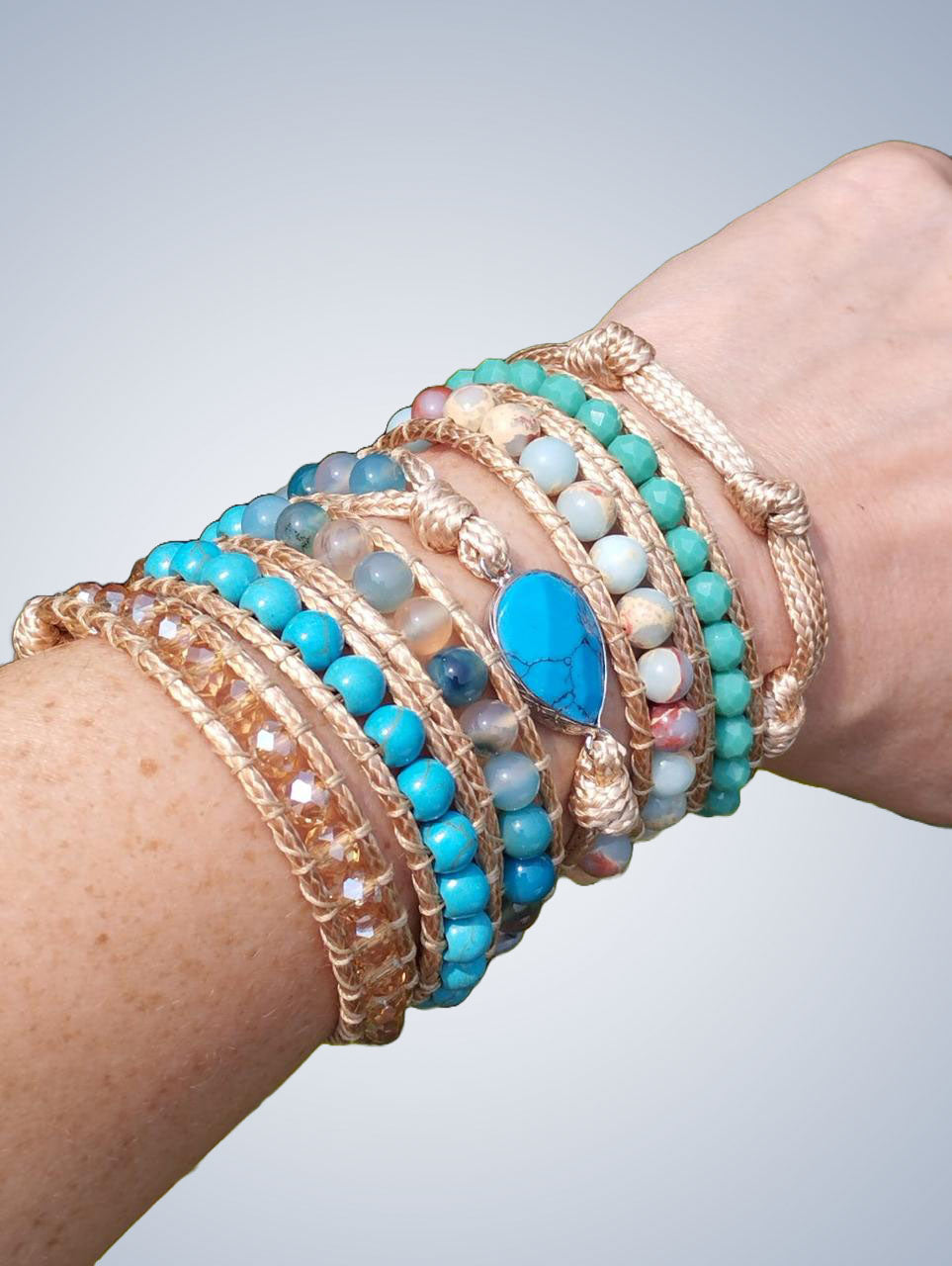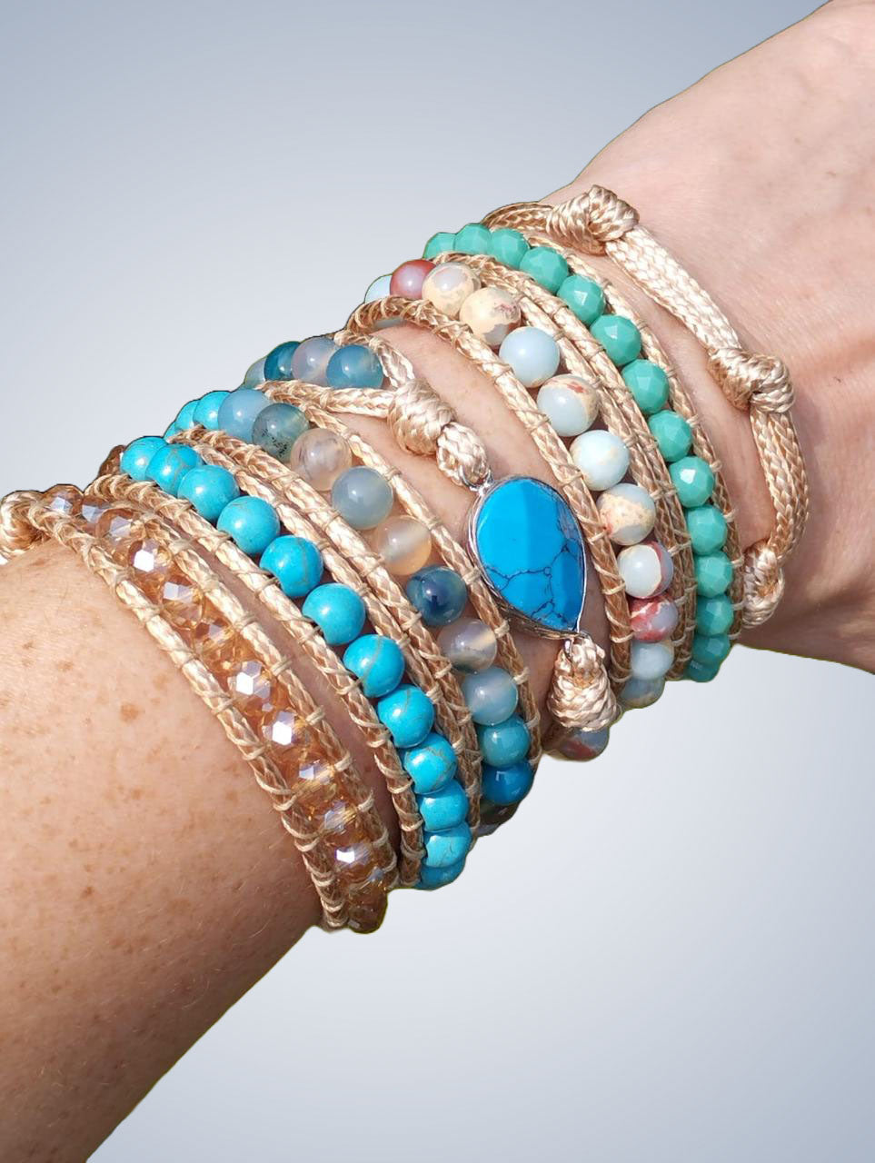Pedras naturais: Howlita Turquesa, Ágata Azul e Jaspe Imperial Cristais de Vidro Corda de poliéster |