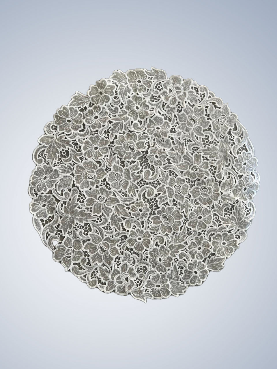 Ao ser colocada sobre a mesa, esta toalha de mesa bordada Richelieu (técnica de bordado recortado) transforma o ambiente, elevando qualquer refeição a um evento especial.