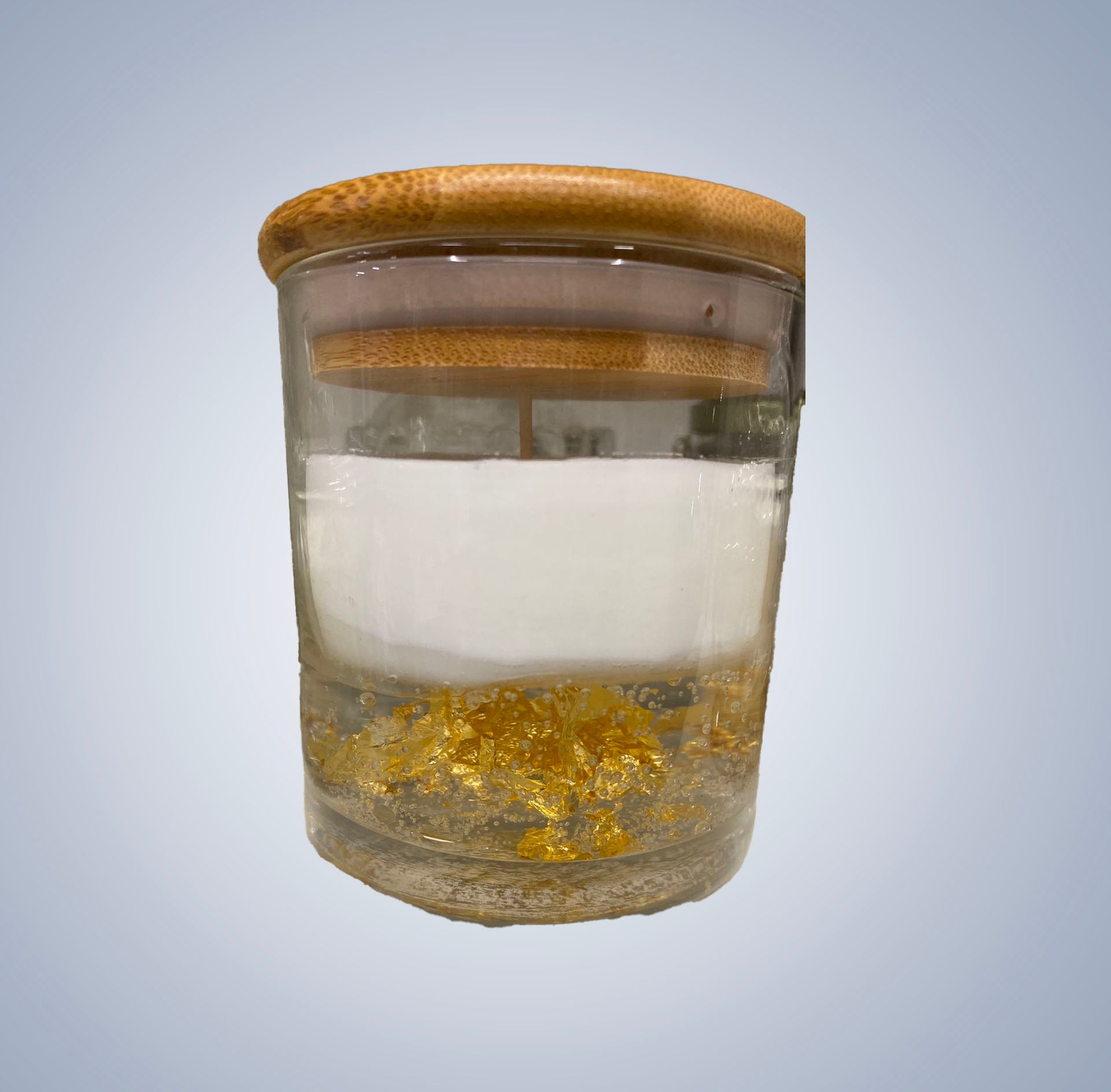 Acenda o caminho para a abundância e boas energias com nossa Vela da Prosperidade, um tesouro artesanal que combina o brilho das folhas de ouro com o perfume revitalizante do alecrim, embalado em um delicado recipiente de vidro com tampa de madeira.